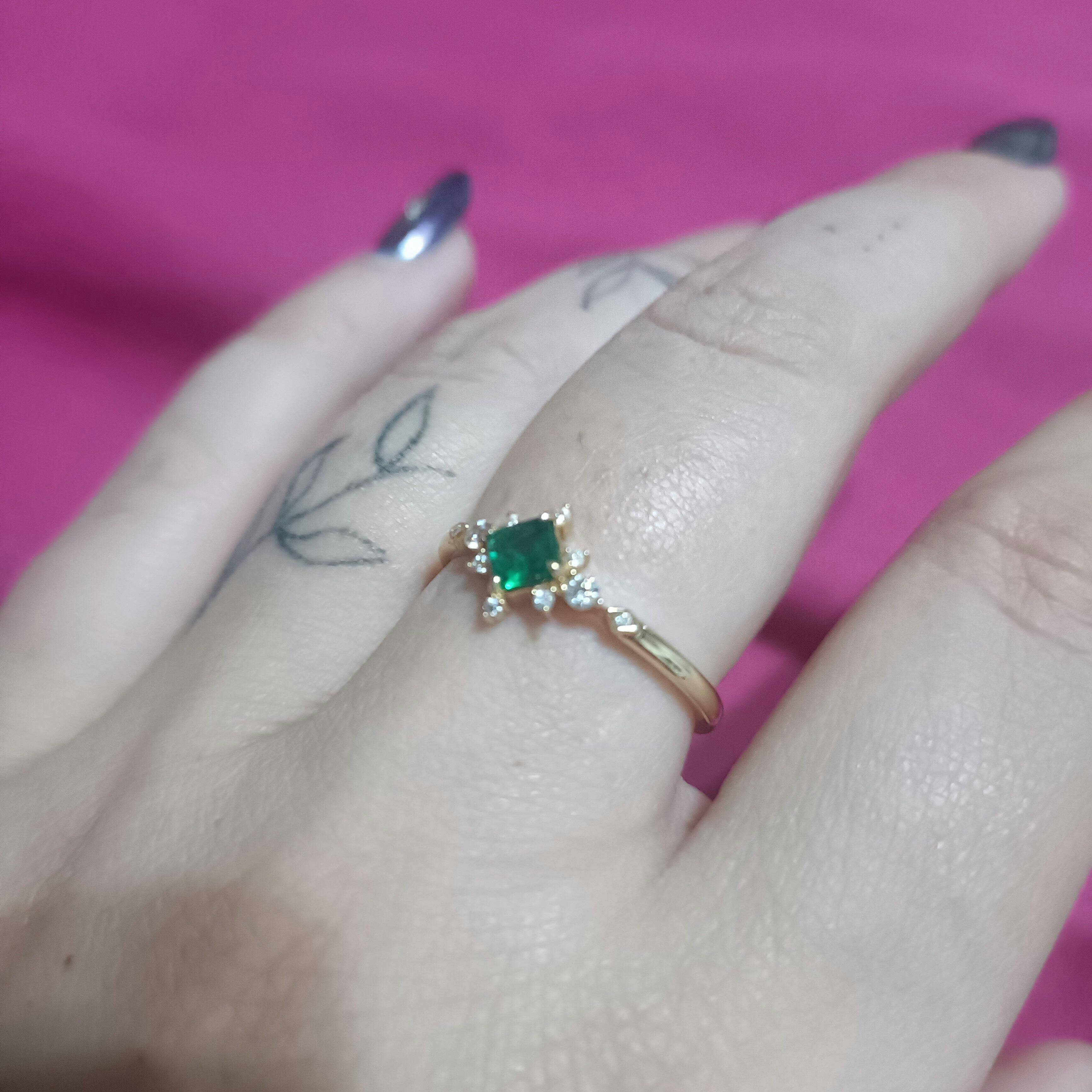 Emerald Hope, un incantevole anello che cattura l'essenza magica della natura. Lo smeraldo centrale risplende come una goccia di rugiada su foglie primaverili, incorniciato da scintillanti moissaniti che danzano come stelle in un regno fatato. La placcatura in oro 14k su argento sterling 925 conferisce un'aura regale a questo gioiello, destinato a chi cerca un tocco di magia principesca al proprio dito.