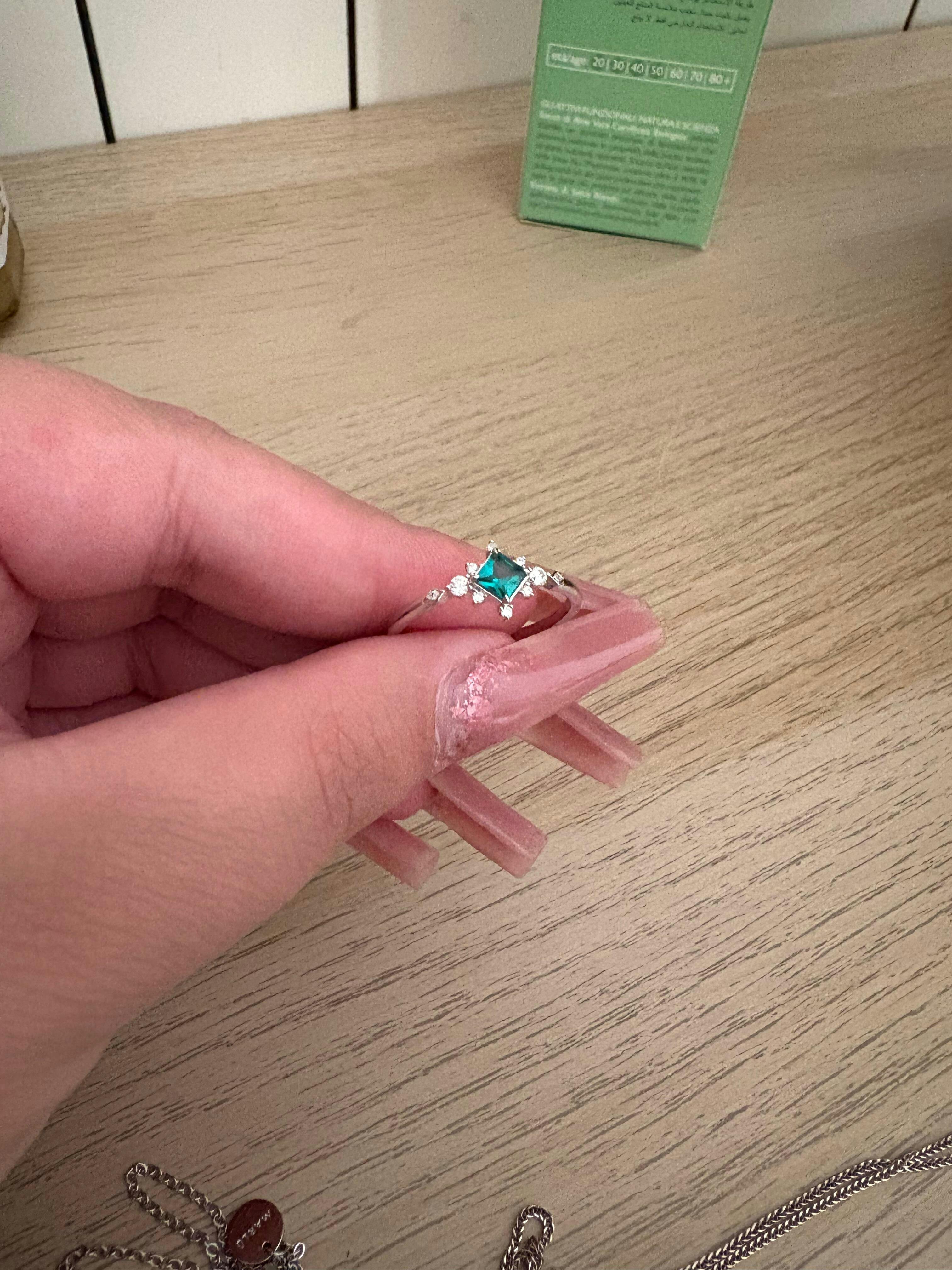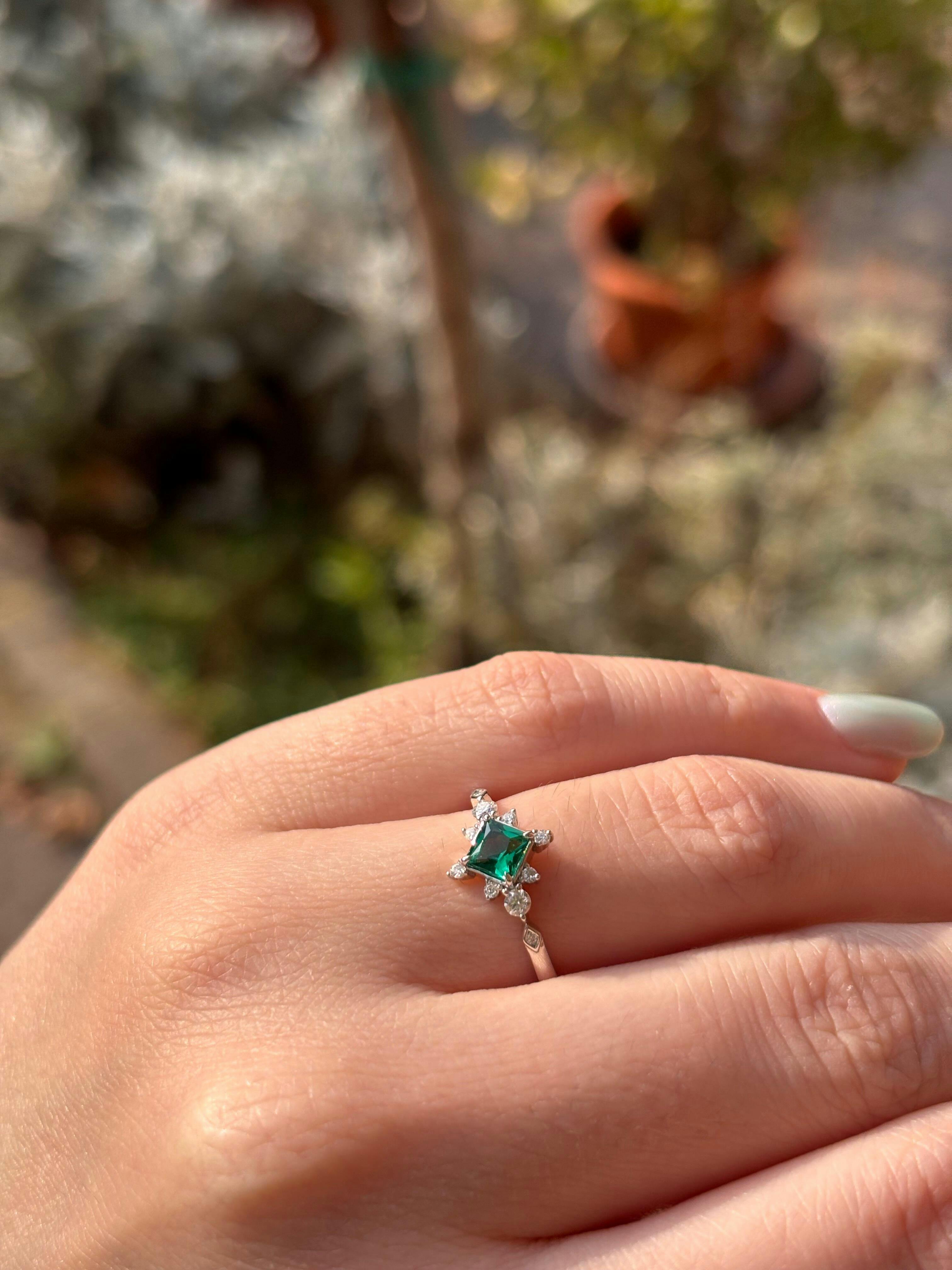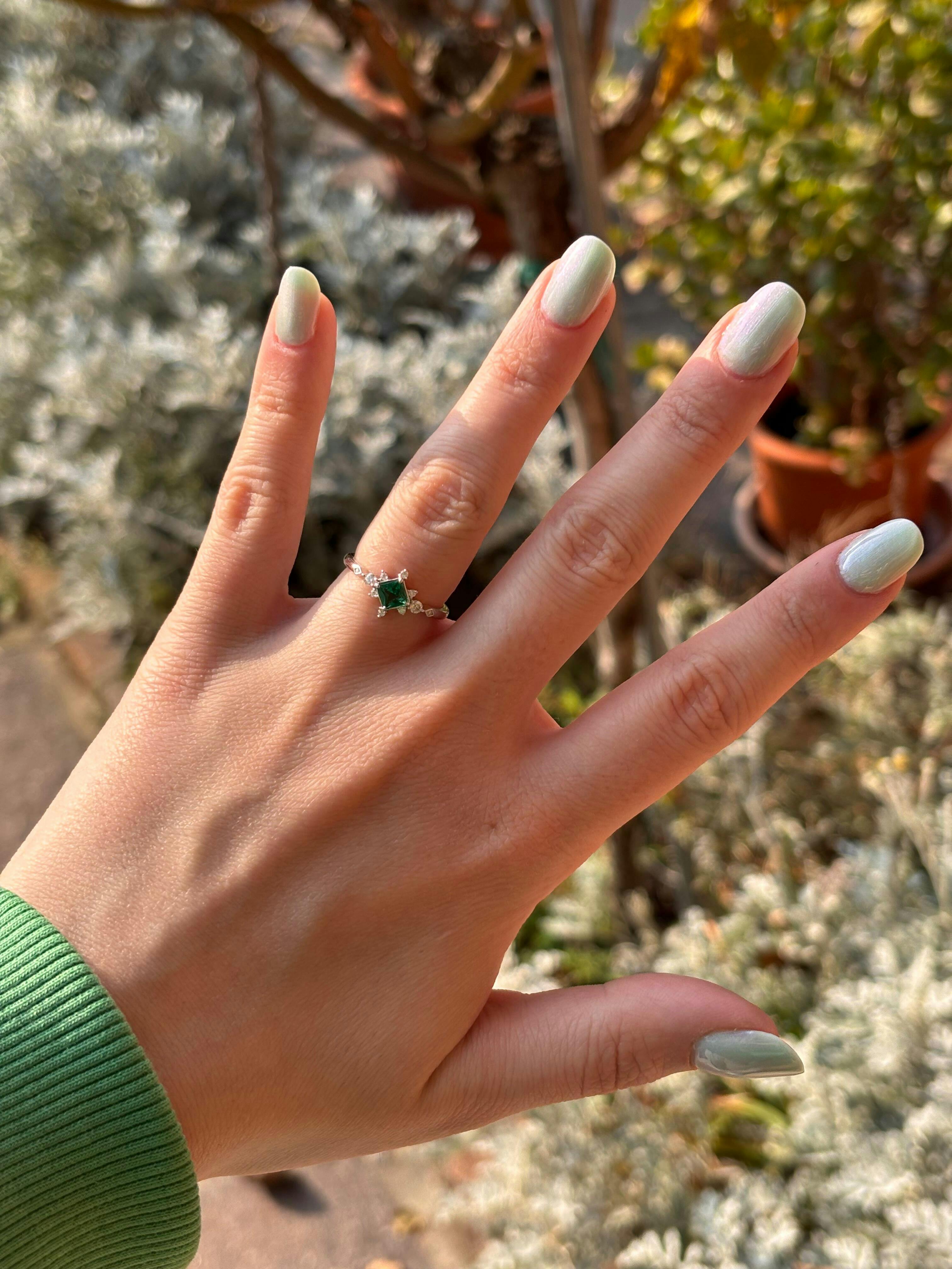 Emerald Hope, un incantevole anello che cattura l'essenza magica della natura. Lo smeraldo centrale risplende come una goccia di rugiada su foglie primaverili, incorniciato da scintillanti moissaniti che danzano come stelle in un regno fatato.